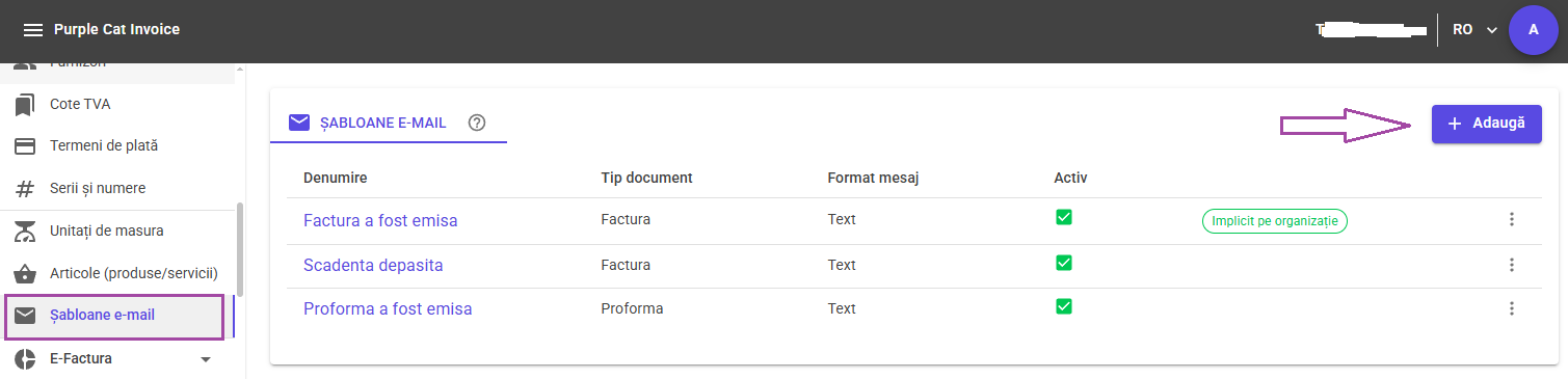 Pentru a adauga un sablon nou, apasati butonul "+ Adauga" din dreapta sus.